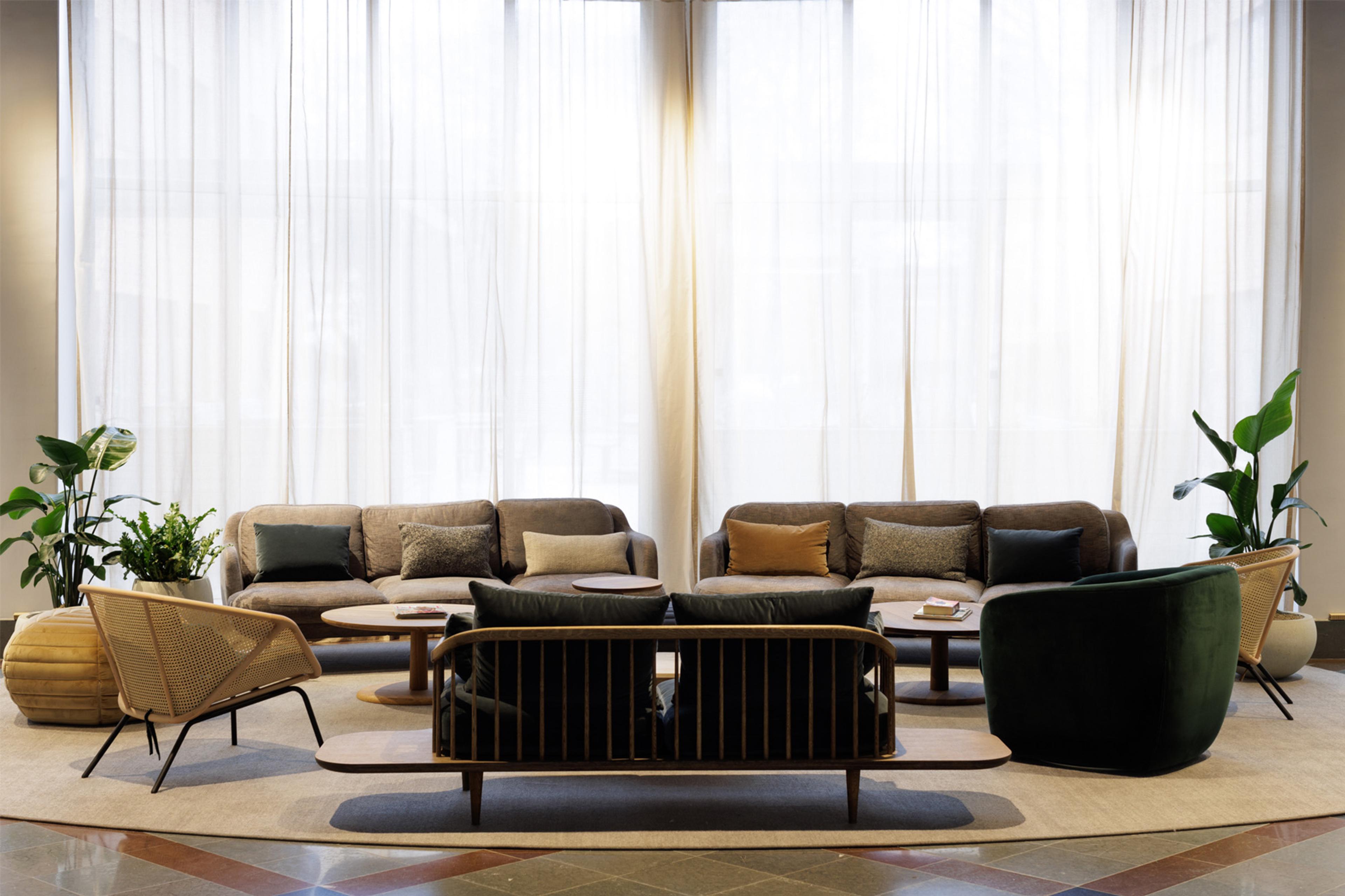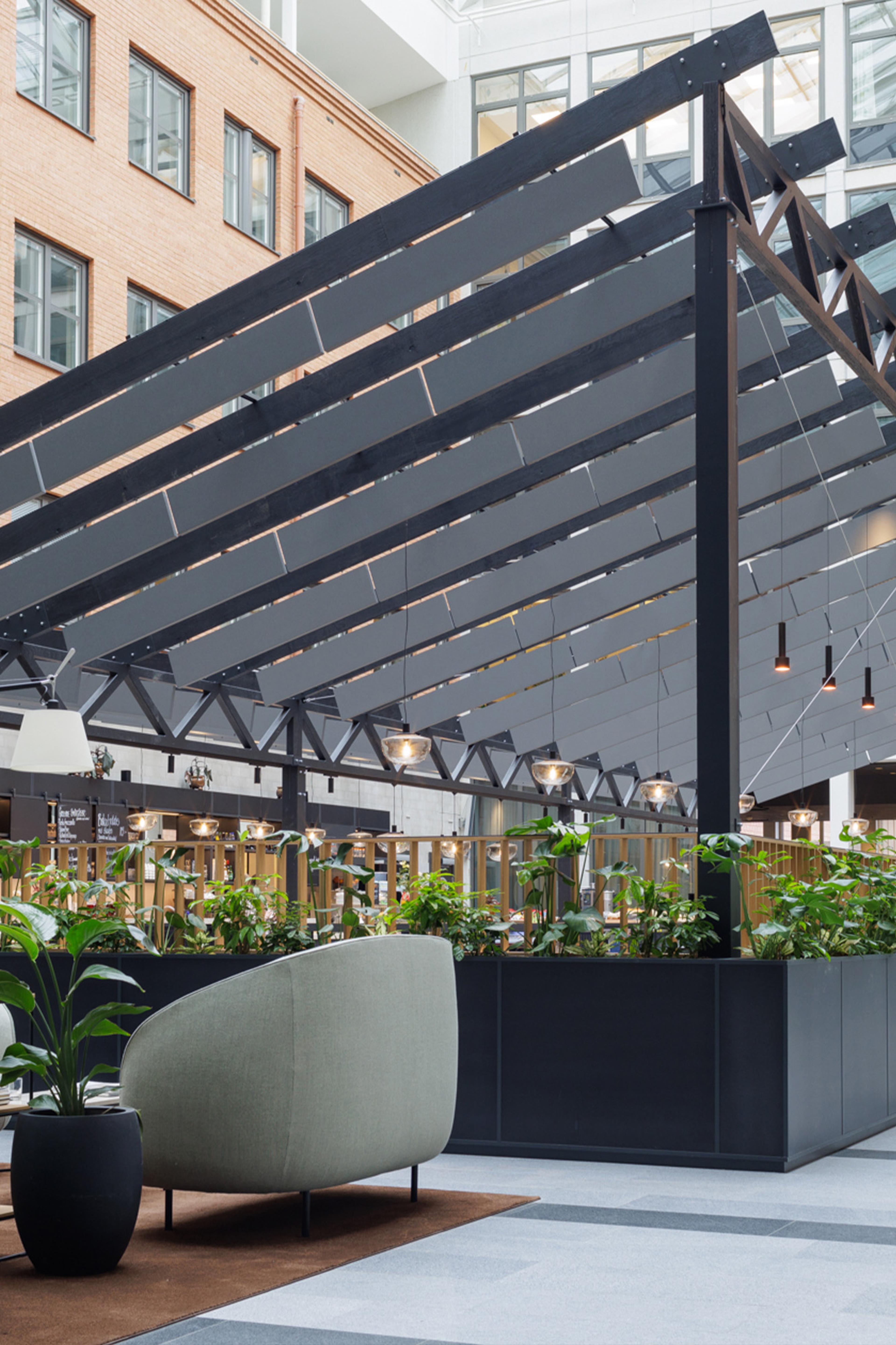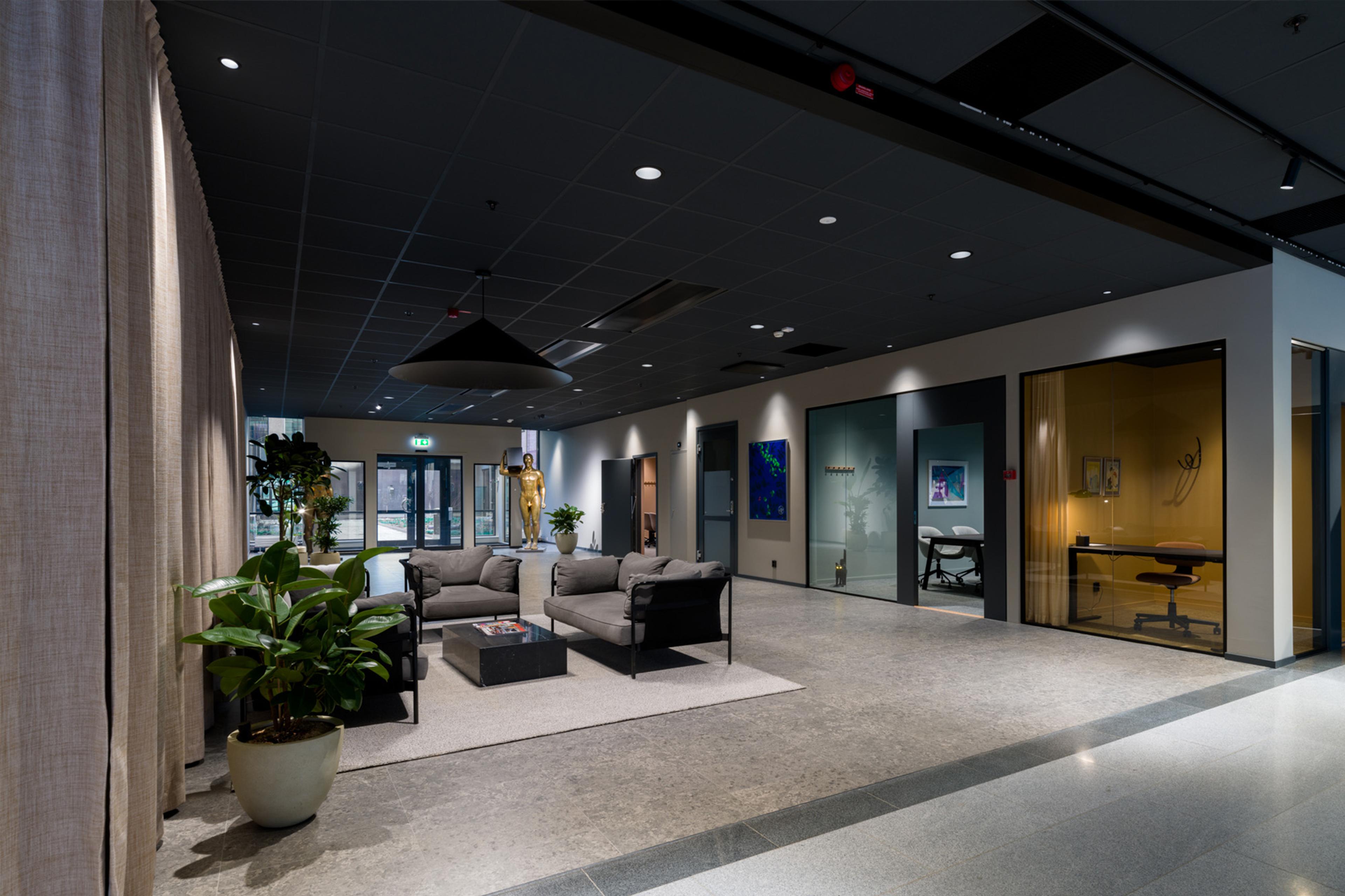 Byggnadens mellanrum har fyllts med aktivet och sociala platser. Från den grönskade utemiljön på gården mot Fyrisån, genom work lounge i burspråkets silande ljus, via pergolan som ger rum till ljusgårdens servering, till reception och mötesrum i länken som förenar fastigheterna Munin och Munin NXT. Inredningen har en stram och dov bas som samspelar med byggnaden. Mjuka toner och material skapar sköna rum för alla i huset.