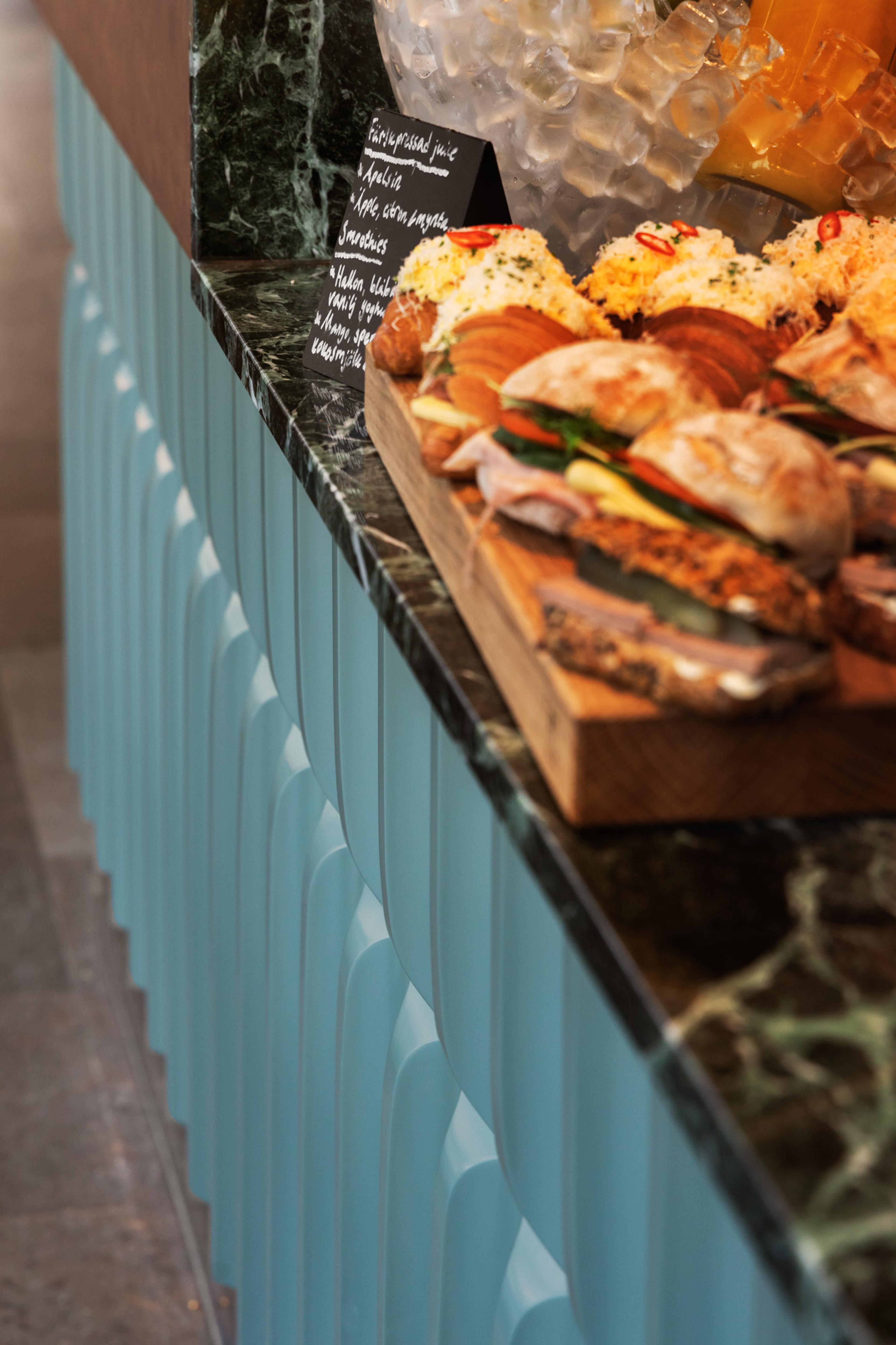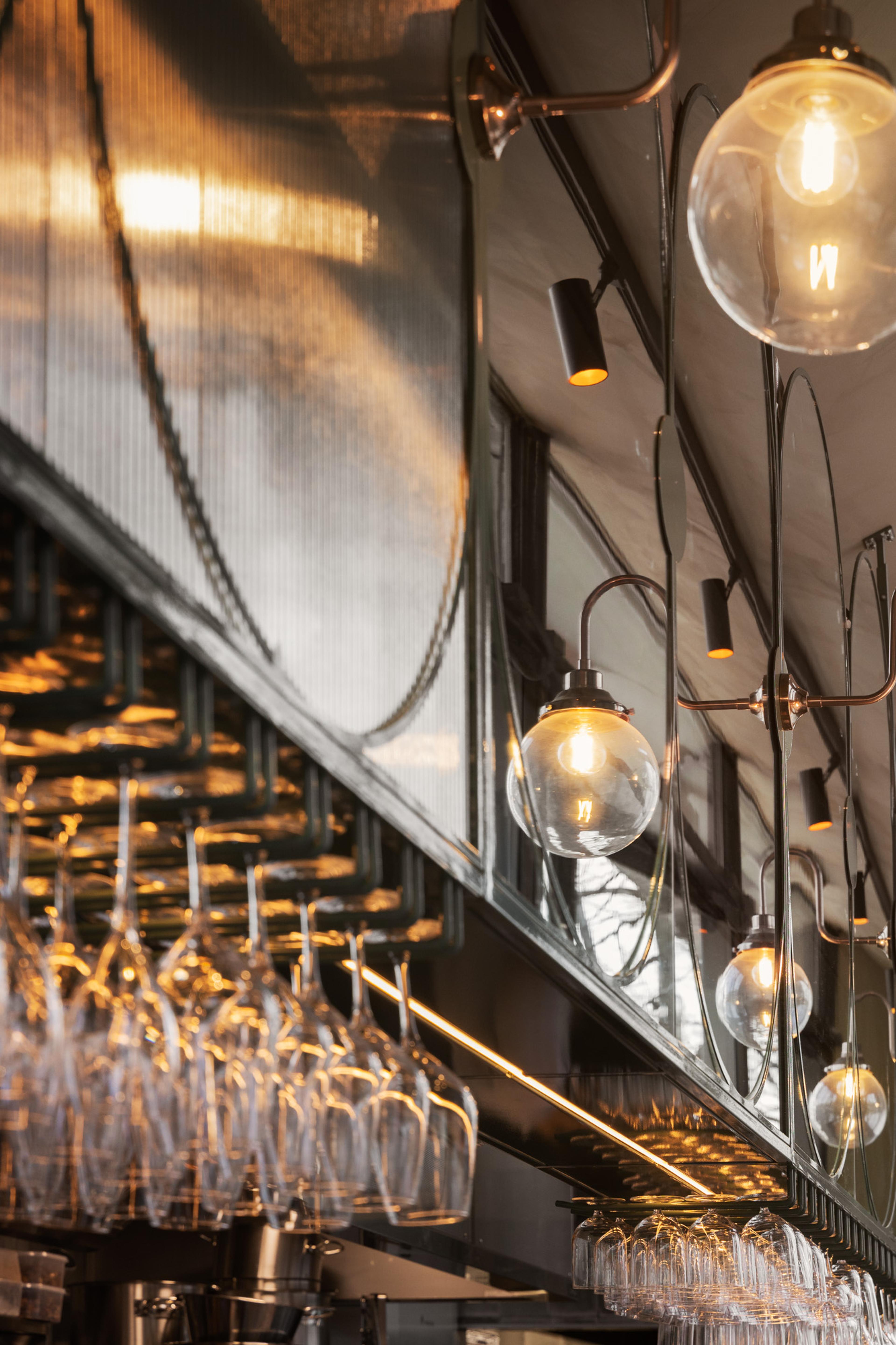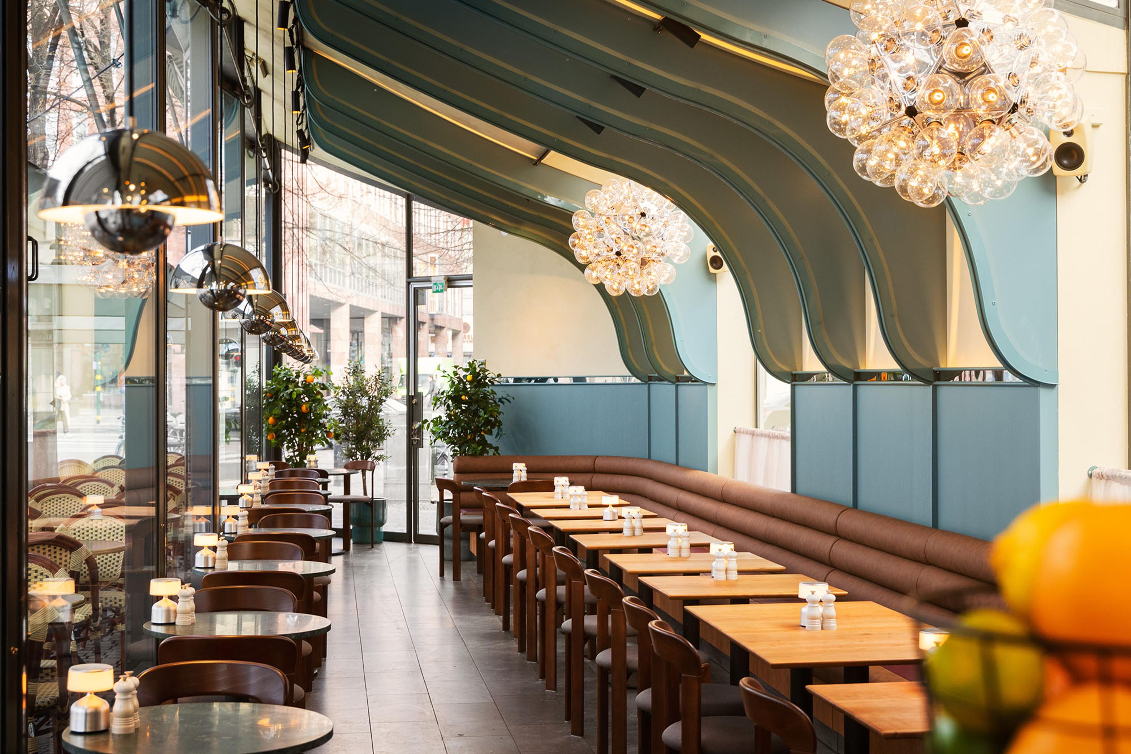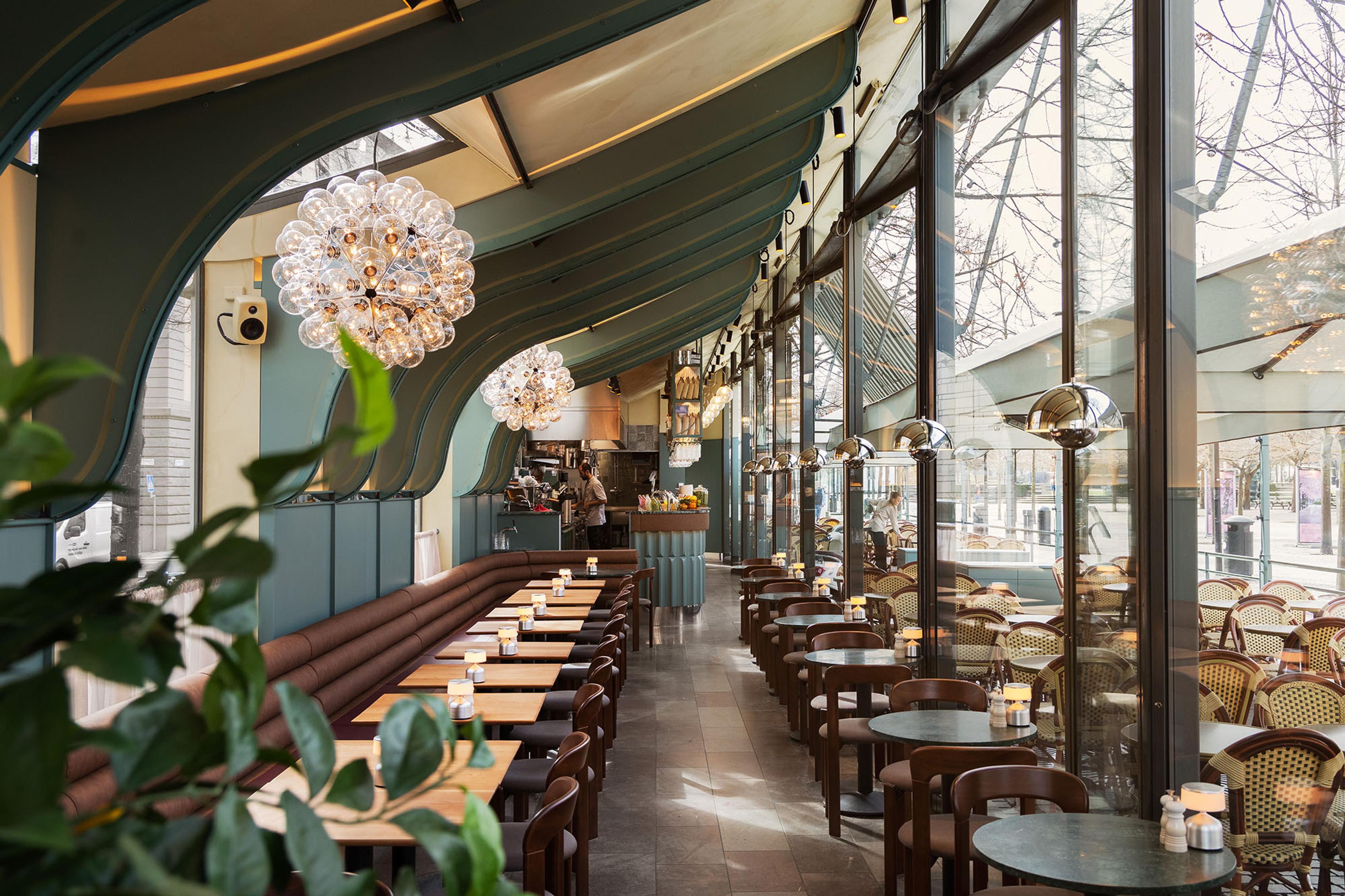 Inredningen leker med den glasade paviljongens långsträckta form. Stora böljande former i taket och ner på väggen ger intressanta perspektiv. Soffan omfamnar det långa rummet och allt bildar en fond för uteserveringen och parken. Det är grönt, lätt och lekfullt. Uteserveringen är enorm och tecknas fram med luftiga linjer av smide och glödljus. Rörstrandsgatans känsla anas här, i Kungsan på Non Solos vis.
